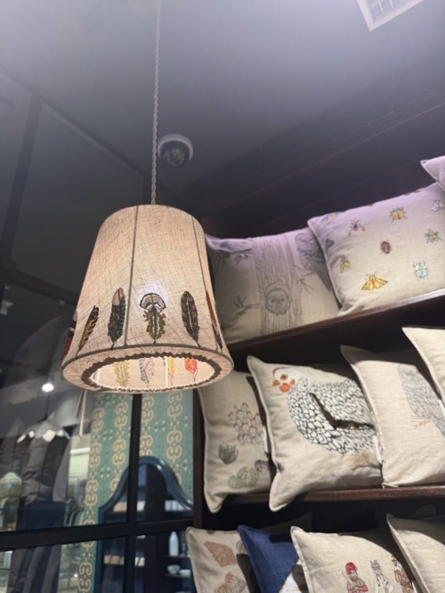 以前お客様に提案した、リーフ柄のテーブルランプは売り切れ。今はペンダント照明だけだそう。