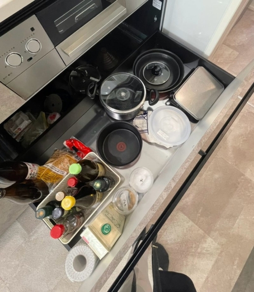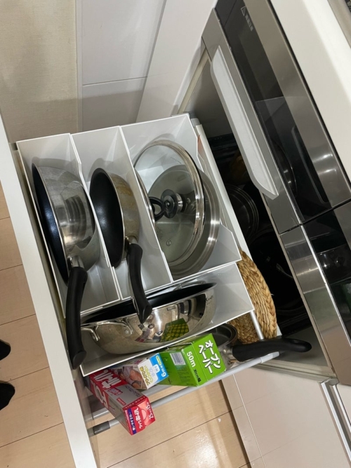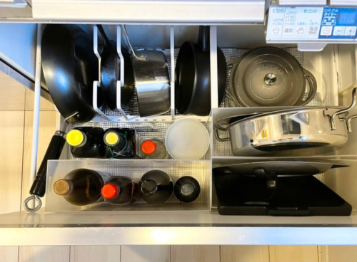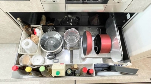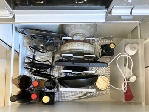 コンロ下はコンロで使うモノを収納し、さらに使いやすくなりました。