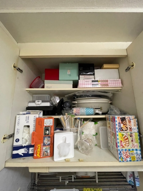 ありがちな吊り戸棚の中、使っていない物がありそう