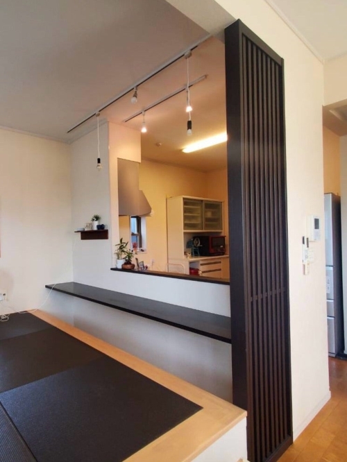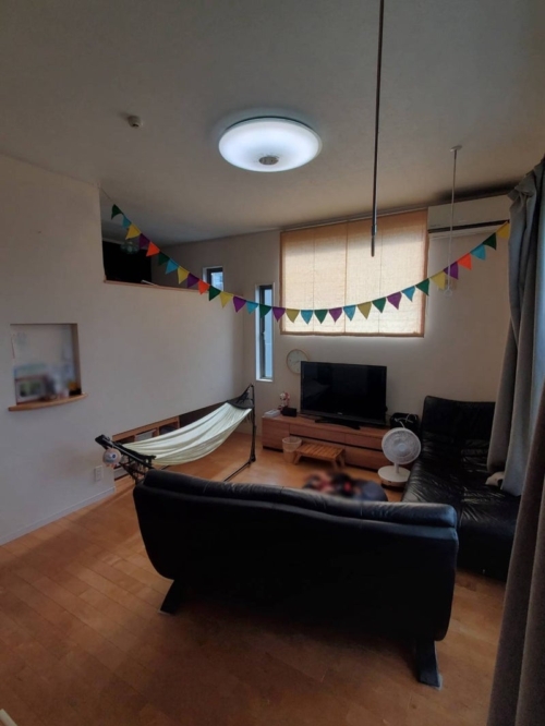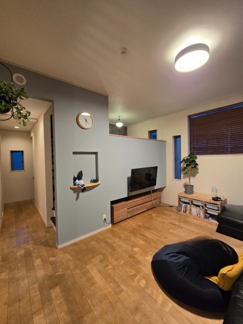 リビングを少しでも広く、使いやすくするため、テレビの場所を変え、壁つけにしました。