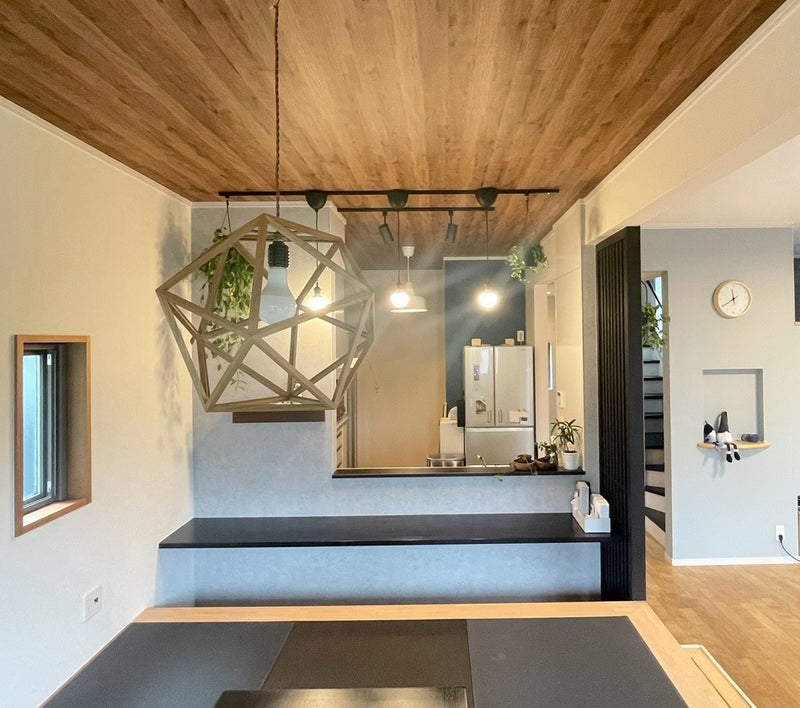 天井の木目クロスをキッチンまで貼り、一体感を。