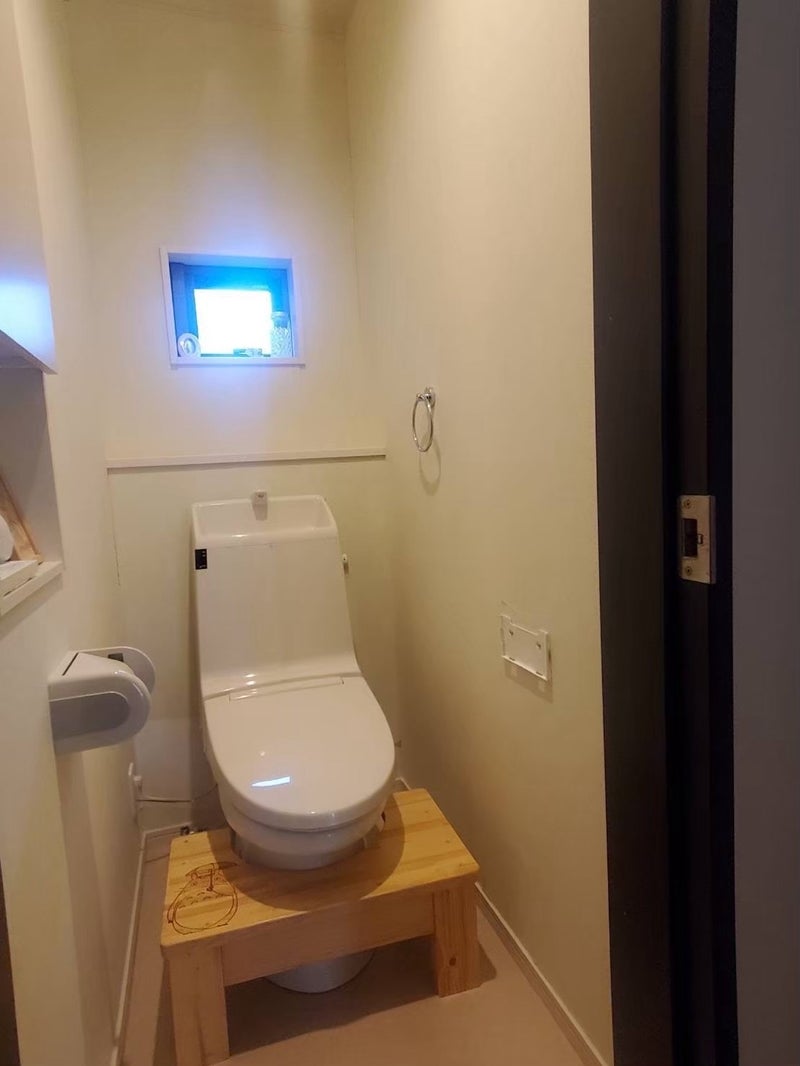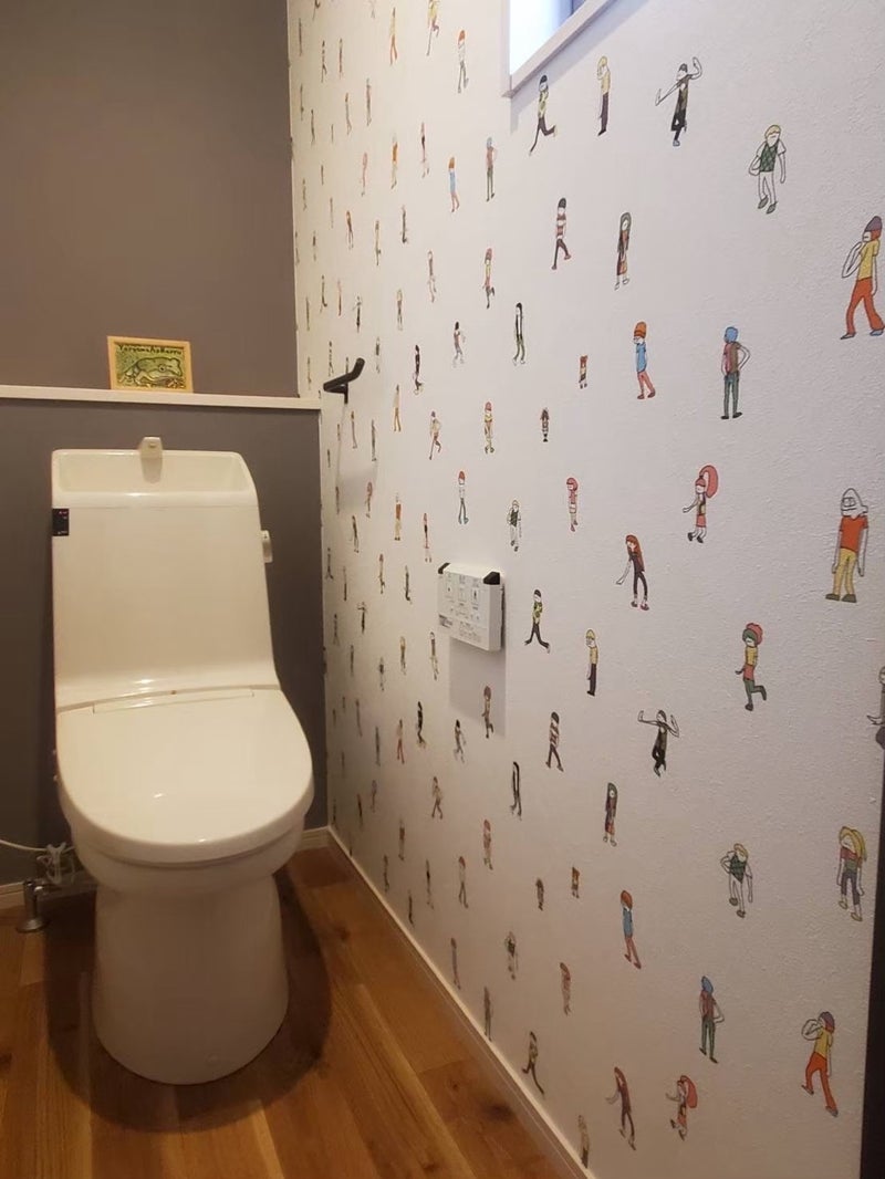 カラフルでメッセージ性のある壁紙で、気分が明るくなるトイレになりました。床はフローリング調のフロアタイル。
