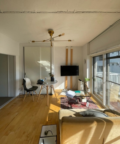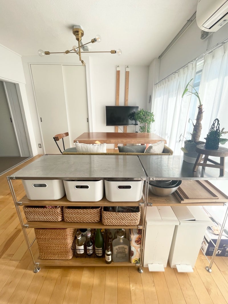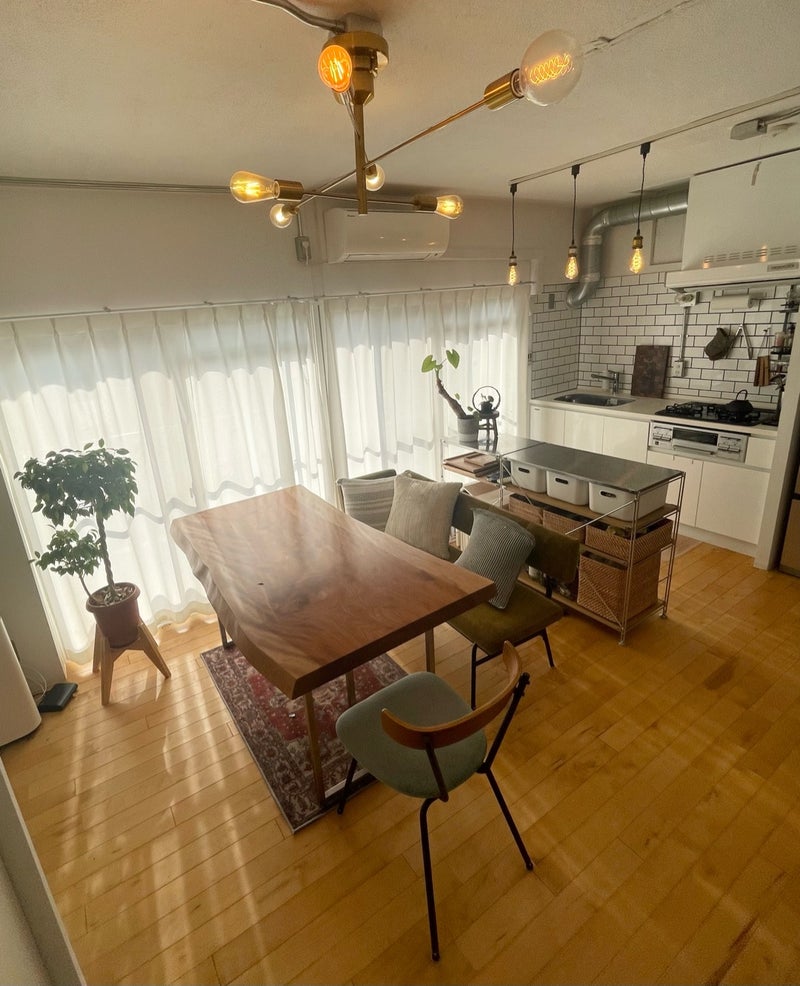 インテリアコーディネート 30代カップルの陽だまり暮らし 引越し後、前の家で使っていた家具を、とりあえず再利用しています。 【BEFORE】 【AFTER】 家具で部屋をふんわり仕切って行動ゾーニング。どこにいても顔が見え、会話が聞こえてきます。写真手前左に洗面所、右にバルコニーに出る窓、洗濯干しも最短ルートで叶えます。 限られたスペースでゆったり過ごすには、置き家具を厳選する事が大事。動線に必要な床6割の余白は死守。一枚板のテーブルは、お客様が選ばれました。 一生モノの家具は家族の一員ですね。ありがとうございました。